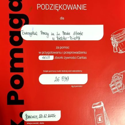 H2: Oficjalne podziękowania dla Towarzystwa Pomocy im. św. Brata Alberta Z radością informujemy, że Towarzystwo Pomocy im. św. Brata Alberta po raz kolejny otrzymało oficjalne podziękowania od Caritas Diecezji Bielsko-Żywieckiej za zaangażowanie i współpracę przy ogólnopolskiej zbiórce żywności „Tak Pomagam”. Rekordowa zbiórka – 5-6 grudnia 2025 r. W dniach 5–6 grudnia 2025 roku nasi wolontariusze, …