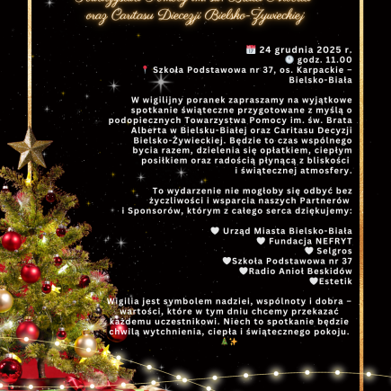 24 grudnia 2025 roku o godzinie 11.00 w Szkole Podstawowej nr 37 na osiedlu Karpackim w Bielsku-Białej odbędzie się uroczysta Wigilia przygotowana dla podopiecznych Towarzystwa Pomocy im. św. Brata Alberta w Bielsku-Białej. To wyjątkowe, świąteczne spotkanie będzie okazją do wspólnego przeżywania Bożego Narodzenia w atmosferze życzliwości, bliskości i wzajemnego wsparcia. Wigilia, organizowana z myślą o …