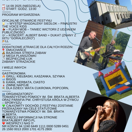 Albertowska Trasa Dobra już 14 09 2025 r. W niedzielę, 14 09 2025 roku, przy parafii pw. Chrystusa Króla w Żywcu–Sporyszu odbędzie się wyjątkowe wydarzenie – Festyn Parafialny „Albertowska Trasa Dobra”. Start zaplanowano na godzinę 13:00. Program artystyczny Na scenie pojawią się wyjątkowi artyści i animatorzy. Publiczność rozgrzeje Magdalena Siedlok, finalistka programu The Voice Kids. …