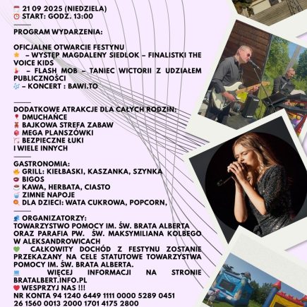 Już w niedzielę, 21 09 2025 roku, w parafii pw. św. Maksymiliana Kolbego w Aleksandrowicach odbędzie się wyjątkowe wydarzenie – Festyn Parafialny „Albertowska Trasa Dobra”. Start o godzinie 13:00. Program artystyczny Na uczestników czeka bogaty program muzyczny i rozrywkowy. Festyn otworzy występ Magdaleny Siedlok, finalistki The Voice Kids. Nie zabraknie również wspólnej zabawy w rytmie …