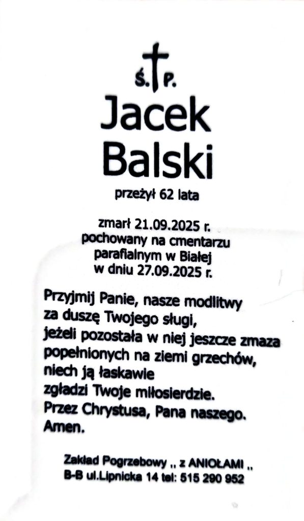 Wczoraj, 27 września 2025 roku, na cmentarzu parafialnym w Białej spoczął nasz wspaniały podopieczny, przyjaciel i współtwórca dobra – Jacek Balski. Przeżył 62 lata, a odszedł od nas 21 września, pozostawiając pustkę, której trudno będzie wypełnić.
