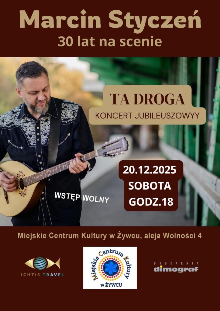 Trzy dekady drogi artystycznej, setki piosenek, tysiące spotkań z ludźmi i sensy, które zostają w sercu na całe życie. Już 20 grudnia (sobota) o godz. 18:00 w Miejskim Centrum Kultury w Żywcu odbędzie się wyjątkowy koncert jubileuszowy Marcina Stycznia „Ta droga”, podsumowujący 30 lat twórczości artysty.