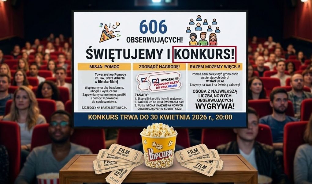Pamiętajcie o słowach naszego patrona, św. Brata Alberta: „Powinno się być dobrym jak chleb”. Ten konkurs to świetna okazja, by połączyć przyjemne z pożytecznym. Ty masz szansę na darmowe wyjście do kina, a my – dzięki Twojemu zaangażowaniu – zyskujemy nowe zasięgi, by skuteczniej pomagać potrzebującym w Bielsku-Białej.