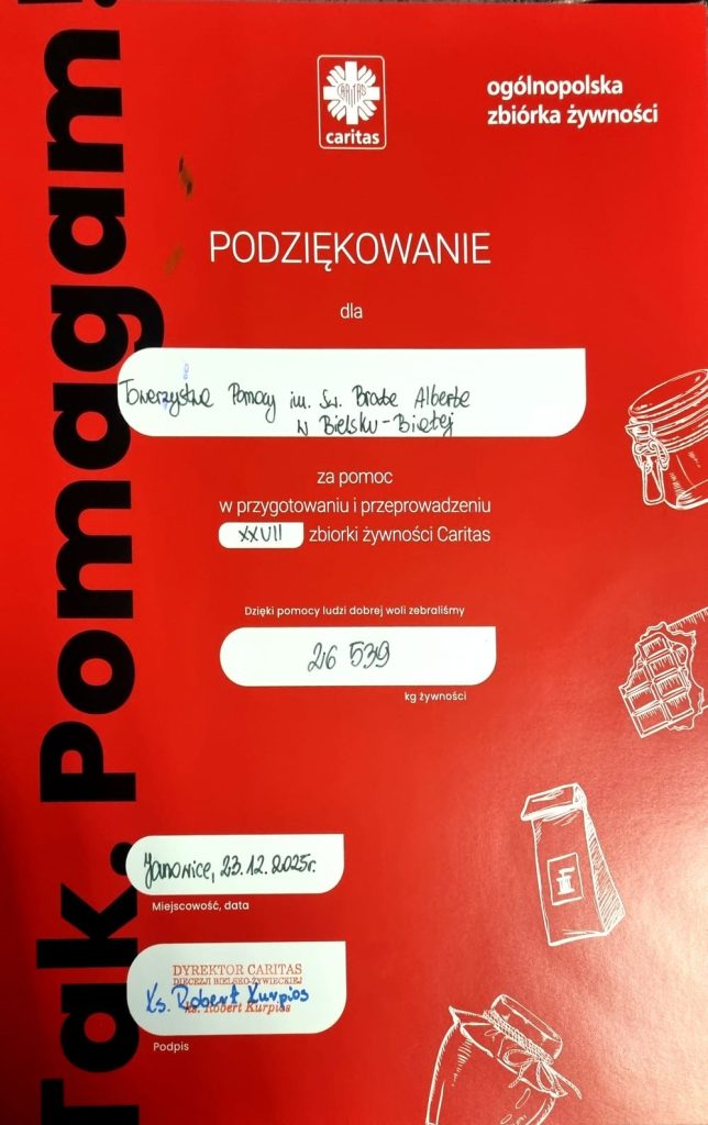 Z radością informujemy, że Towarzystwo Pomocy im. św. Brata Alberta po raz kolejny otrzymało oficjalne podziękowania od Caritas Diecezji Bielsko-Żywieckiej za zaangażowanie i współpracę przy ogólnopolskiej zbiórce żywności „Tak Pomagam”.
