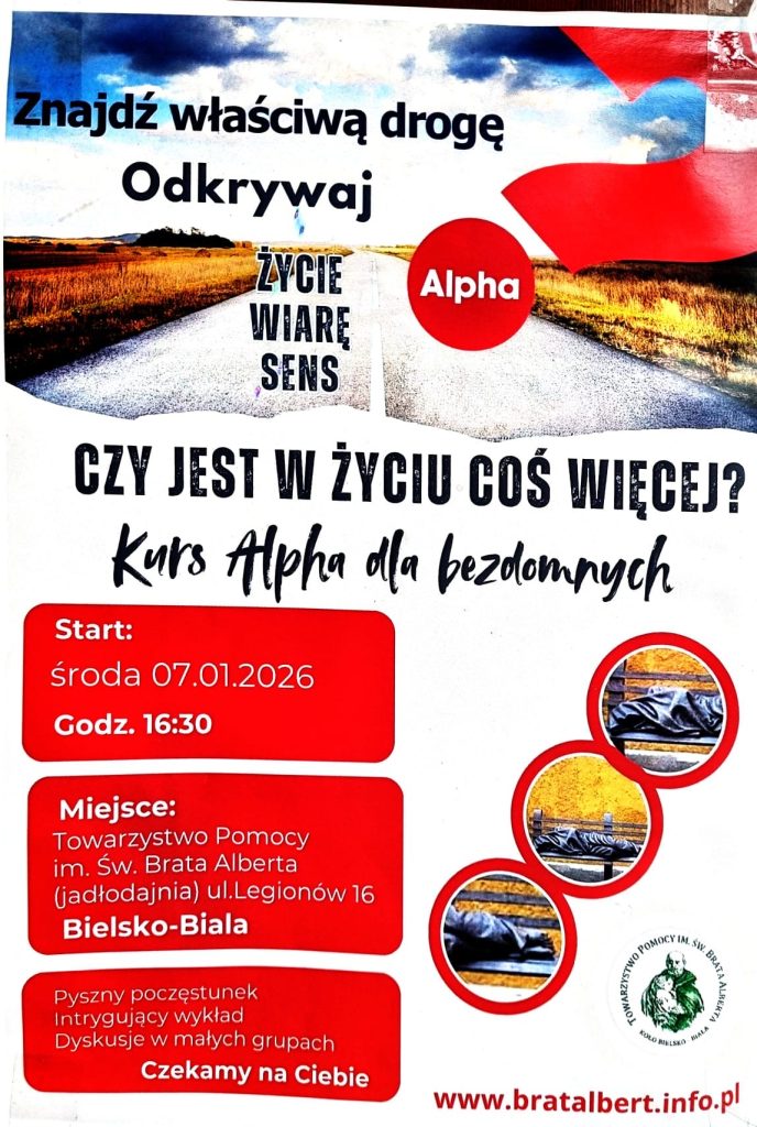 To pytanie nosi w sercu wielu ludzi. Szczególnie tych, których życie poprowadziło przez samotność, kryzysy i bezdomność. Dlatego od 7 stycznia 2026 roku w Towarzystwie Pomocy im. św. Brata Alberta w Bielsku-Białej rozpoczynamy Kurs Alpha dla osób bezdomnych – przestrzeń nadziei, rozmowy i odkrywania sensu życia.